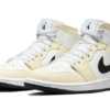 L Air Jordan 1 Mid Latte di cocco Presenta una base in pelle oscillante tra bianco rotto e bianco. A questo si aggiunge uno swoosh nero, concesso alla suola e al marchio, offrendo un contrasto interessante.