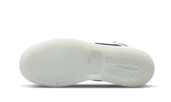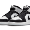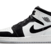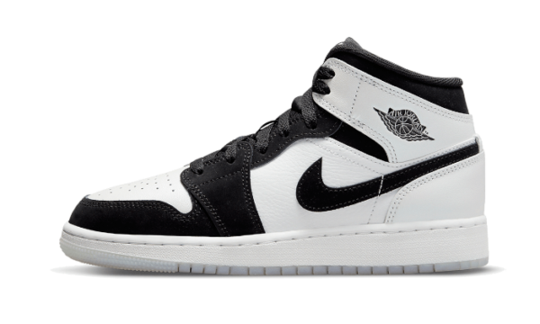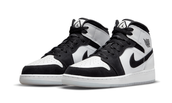 Là Air Jordan 1 Mid Diamond Shorts presenta una base in pelle bianca che è coperto da pannelli in camoscio nero e riprende il blocco di colore emblematico del Black Dito del piede. Un logo a due colori sotto forma di diamante copre la lingua e si riferisce ai motivi presenti sui pantaloncini di Jordan Brand. L’intera silhouette poggia sulla suola bianca alSuota trasparente.