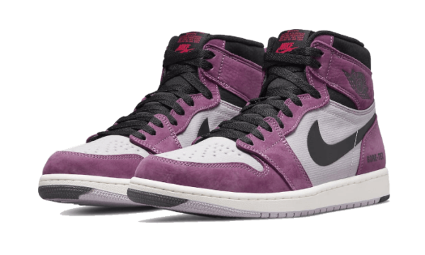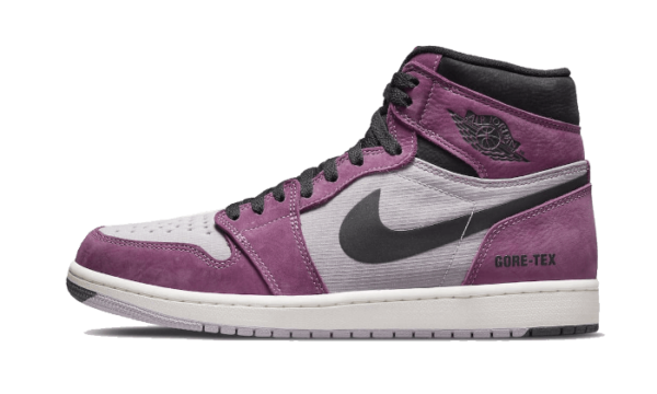 Air Jordan 1 High Element Gore-Tex Berry har en overdel i mauvefarvet tekstil/nubuck ripstop. Flere lilla indsatser står i kontrast til det overordnede look, mens flere sorte highlights på snørebåndene, Swoosh og kraven gør silhuetten mørkere.
